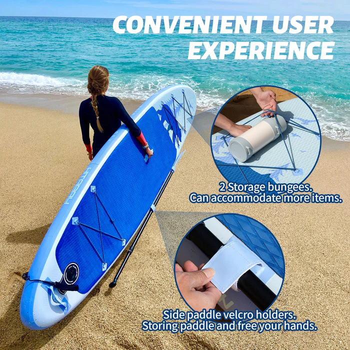 [Ultra light weight Portable SUP]5 minutes for inflate and deflate. HITABAY paddle board net weighs right around 16 pounds (that’s over 30% lighter than most quality Inflatable paddle boards). When deflated; the paddleboard can easily fit in a trunk; be carried on the subway; or even be checked on most major airlines. So you can store or take it with you anywhere.