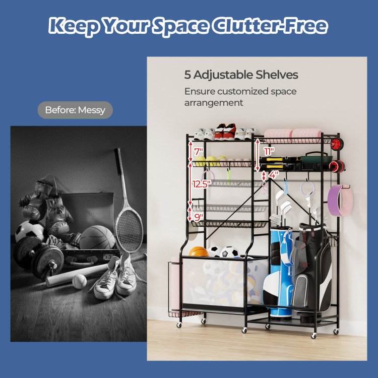 -All-in-one storage solution for different balls, golf bags, dumbbells, and yoga mats