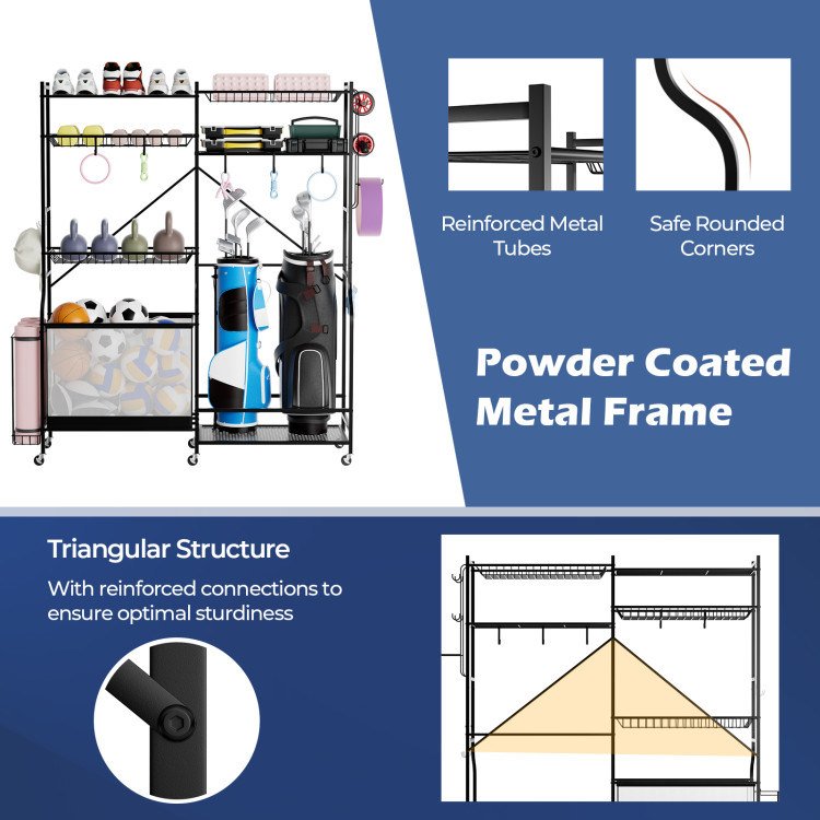 1.All-In-One Organizer: For golf enthusiasts, the sports equipment organizer has a golf bag holder to store 2 bags. Meantime, it also combines a yoga mat holders for gym goers and a ball basket to hold basketballs, footballs, and volleyballs.
